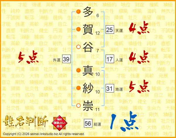 多賀谷真紗崇さんの総運は56画の1点!