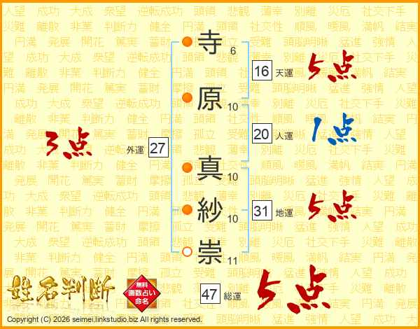 寺(6画)原(10画) 真(10画)紗(10画)崇(11画)