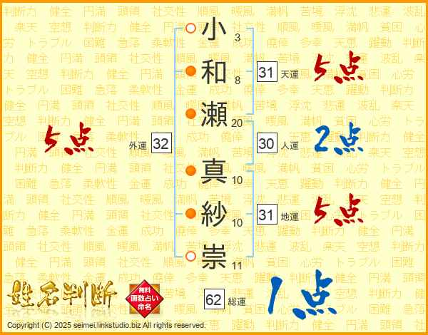 小(3画)和(8画)瀬(20画) 真(10画)紗(10画)崇(11画)