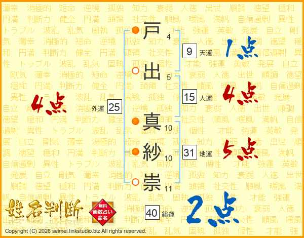 戸(4画)出(5画) 真(10画)紗(10画)崇(11画)