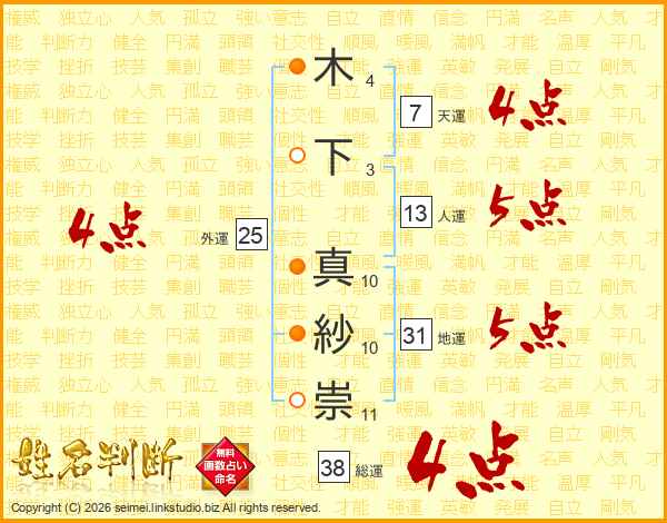 木下真紗崇さんの総運は38画の4点!