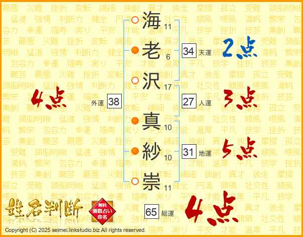 海(11画)老(6画)沢(17画) 真(10画)紗(10画)崇(11画)
