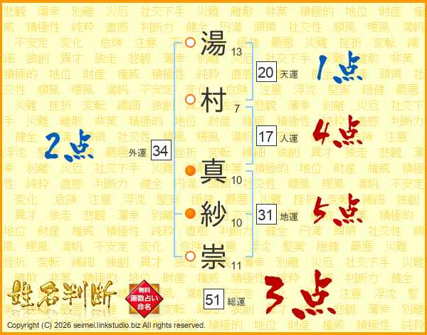 湯(13画)村(7画) 真(10画)紗(10画)崇(11画)
