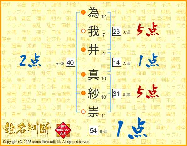 生活面を象徴する運勢です。外部から受ける影響力を表し、結婚運、家庭運や職場、環境への順応性を表します。総運から人運を引いた画数。姓や名が1文字の場合を除く。