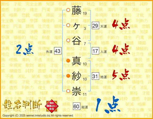 藤(19画)ヶ(3画)谷(7画) 真(10画)紗(10画)崇(11画)