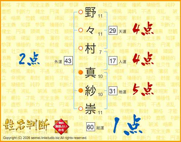 野々村真紗崇さんの外運は43画の2点!