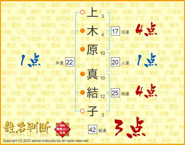 上木原真結子さんの地運は25画の4点!