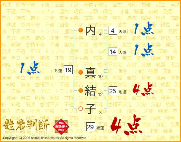 内(4画) 真(10画)結(12画)子(3画)