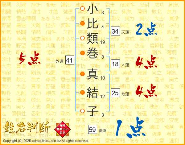 小(3画)比(4画)類(19画)巻(8画) 真(10画)結(12画)子(3画)