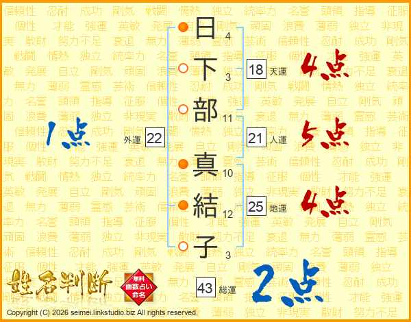日(4画)下(3画)部(11画) 真(10画)結(12画)子(3画)