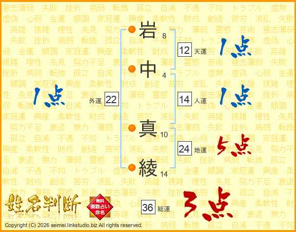 岩(8画)中(4画) 真(10画)綾(14画)