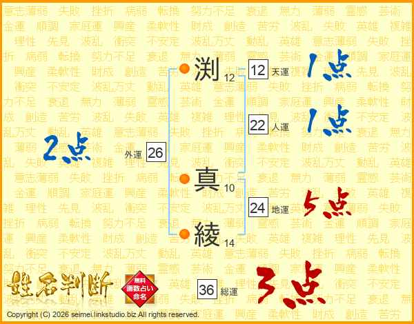 生活面を象徴する運勢です。外部から受ける影響力を表し、結婚運、家庭運や職場、環境への順応性を表します。総運から人運を引いた画数。姓や名が1文字の場合を除く。