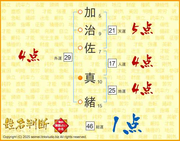 加(5画)治(9画)佐(7画) 真(10画)緒(15画)