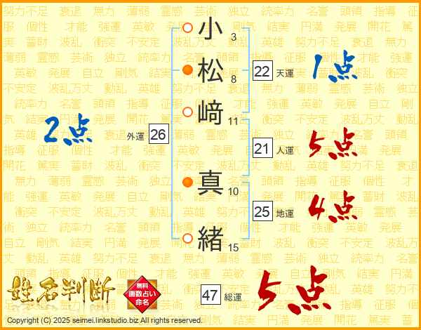 小(3画)松(8画)﨑(11画) 真(10画)緒(15画)