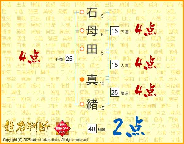 石(5画)母(5画)田(5画) 真(10画)緒(15画)