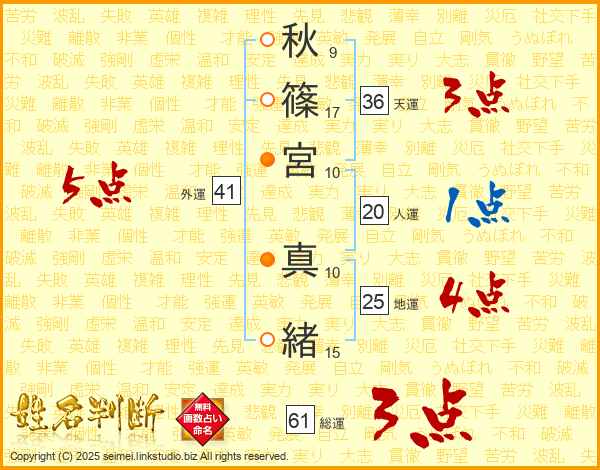 秋(9画)篠(17画)宮(10画) 真(10画)緒(15画)