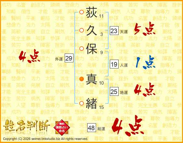荻(11画)久(3画)保(9画) 真(10画)緒(15画)