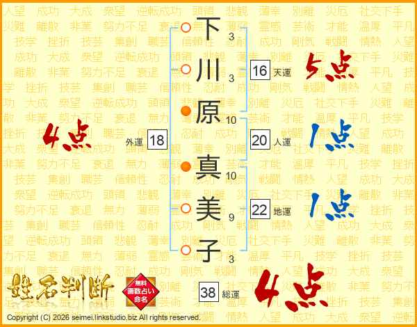 下(3画)川(3画)原(10画) 真(10画)美(9画)子(3画)