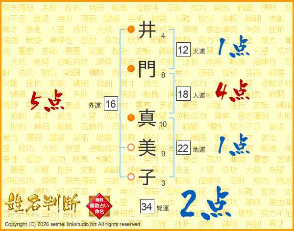 井(4画)門(8画) 真(10画)美(9画)子(3画)