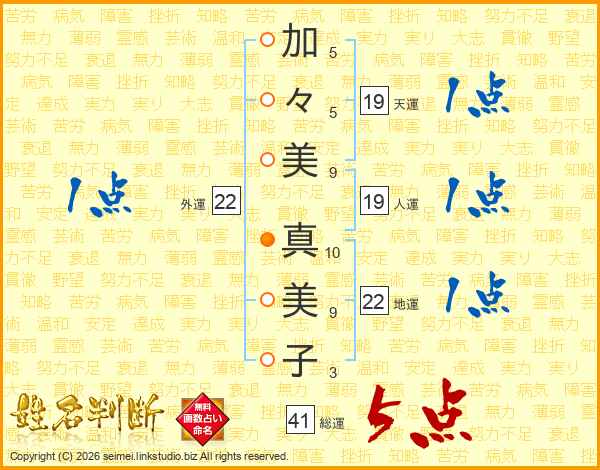 加(5画)々(5画)美(9画) 真(10画)美(9画)子(3画)