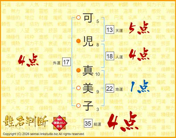 可(5画)児(8画) 真(10画)美(9画)子(3画)
