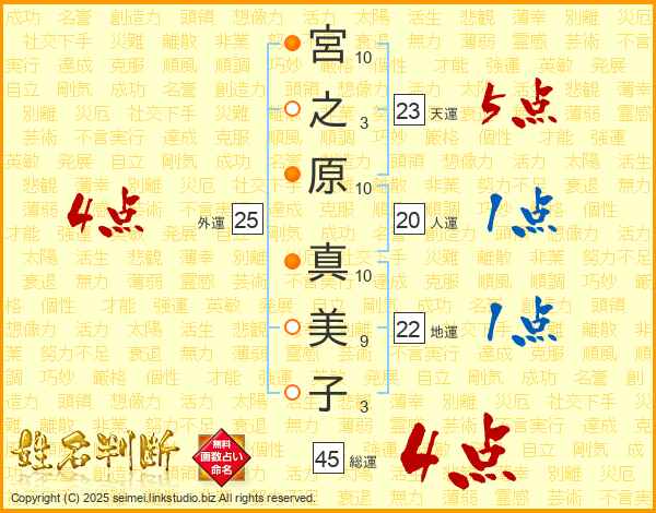 宮(10画)之(3画)原(10画) 真(10画)美(9画)子(3画)