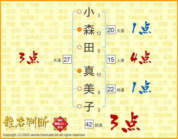 小(3画)森(12画)田(5画) 真(10画)美(9画)子(3画)