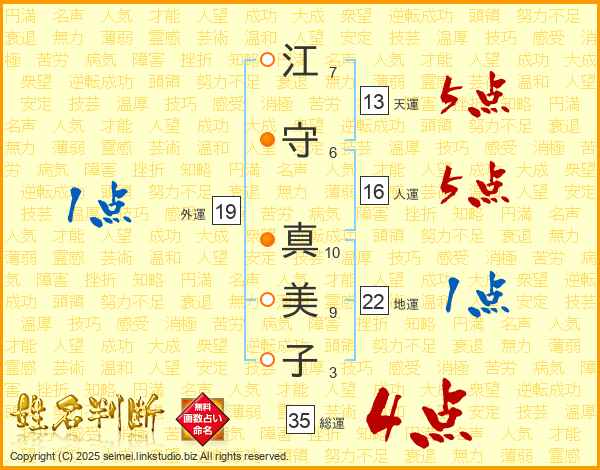 江(7画)守(6画) 真(10画)美(9画)子(3画)