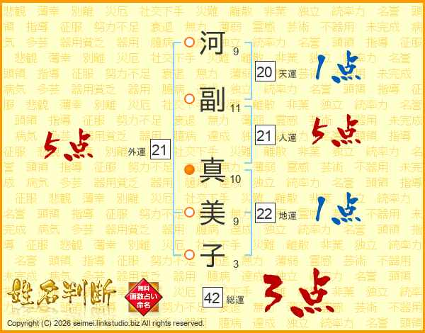 河(9画)副(11画) 真(10画)美(9画)子(3画)