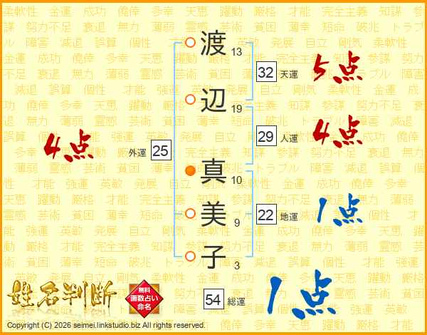 渡(13画)辺(19画) 真(10画)美(9画)子(3画)