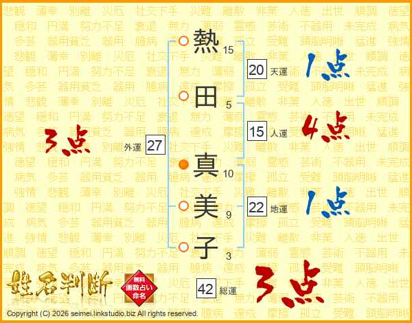 熱(15画)田(5画) 真(10画)美(9画)子(3画)