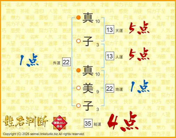 真(10画)子(3画) 真(10画)美(9画)子(3画)