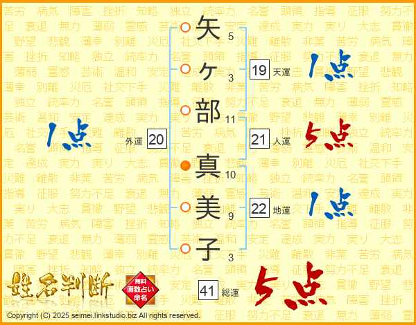 矢(5画)ヶ(3画)部(11画) 真(10画)美(9画)子(3画)