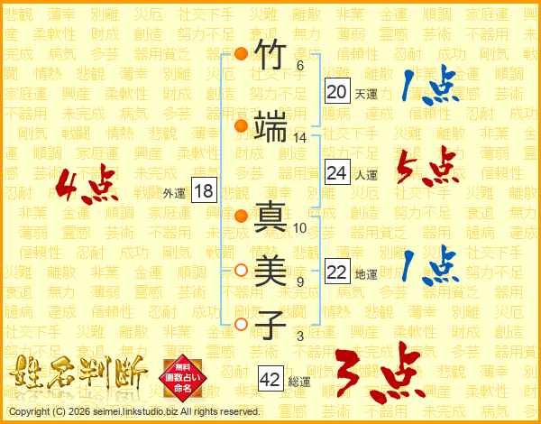 竹(6画)端(14画) 真(10画)美(9画)子(3画)
