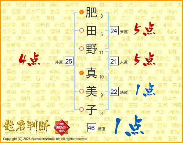 肥田野真美子さんの総運は46画の1点!
