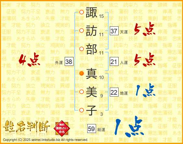 諏(15画)訪(11画)部(11画) 真(10画)美(9画)子(3画)