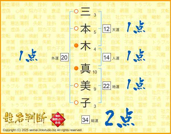 三(3画)本(5画)木(4画) 真(10画)美(9画)子(3画)
