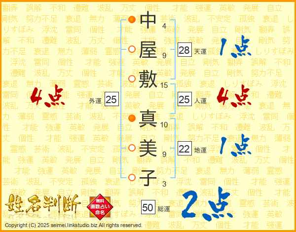 中(4画)屋(9画)敷(15画) 真(10画)美(9画)子(3画)