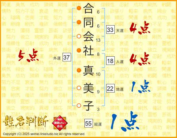 合(6画)同(6画)会(13画)社(8画) 真(10画)美(9画)子(3画)