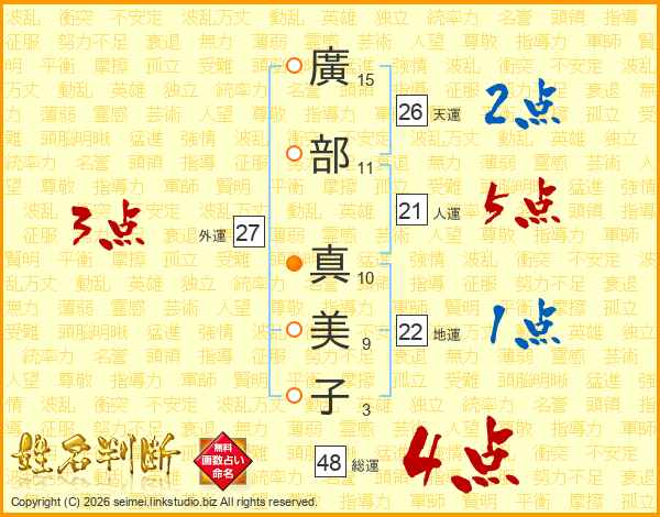 廣(15画)部(11画) 真(10画)美(9画)子(3画)