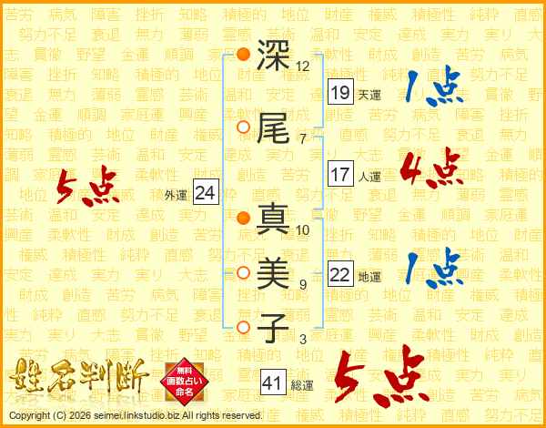 深(12画)尾(7画) 真(10画)美(9画)子(3画)