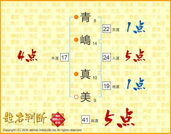 青(8画)嶋(14画) 真(10画)美(9画)