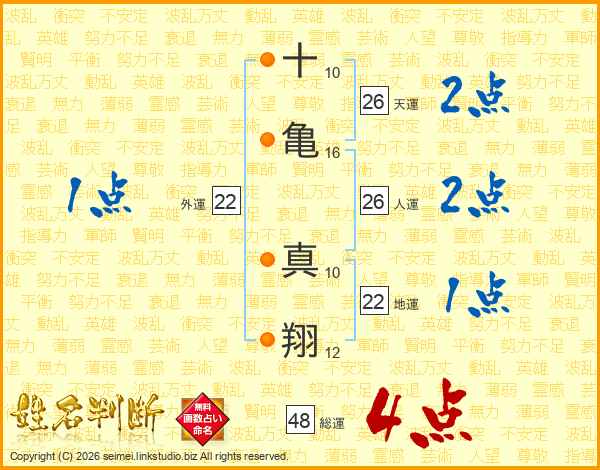 十(10画)亀(16画) 真(10画)翔(12画)