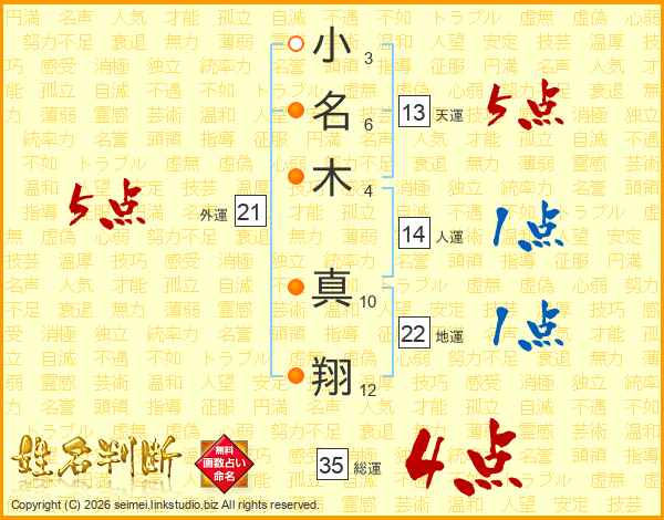 小(3画)名(6画)木(4画) 真(10画)翔(12画)