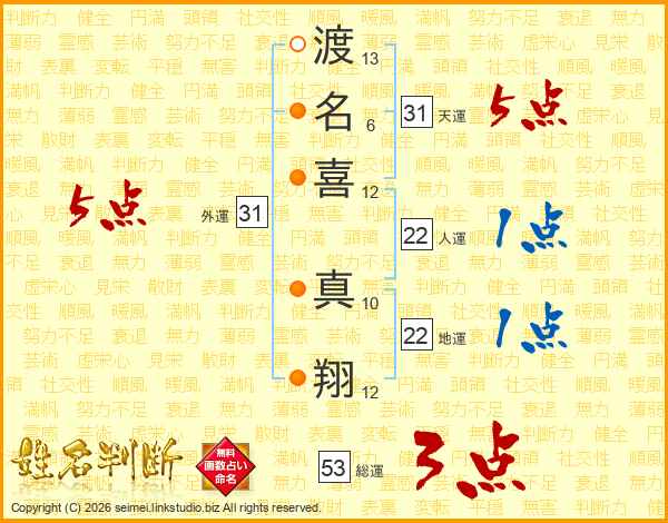 渡(13画)名(6画)喜(12画) 真(10画)翔(12画)