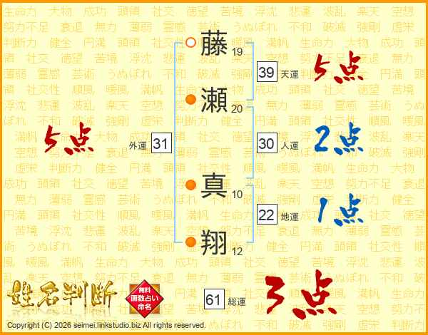 藤瀬真翔さんの総運は61画の3点!