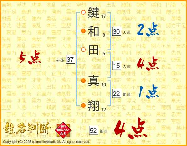 鍵(17画)和(8画)田(5画) 真(10画)翔(12画)