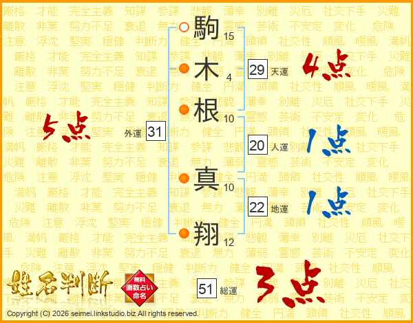 駒木根真翔さんの総運は51画の3点!