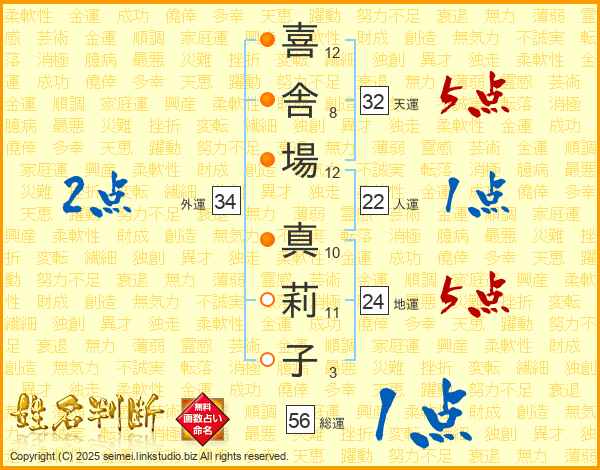 喜(12画)舎(8画)場(12画) 真(10画)莉(11画)子(3画)