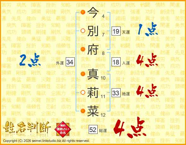 今(4画)別(7画)府(8画) 真(10画)莉(11画)菜(12画)